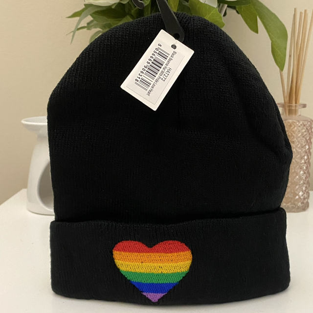 New, lovely knitted adult beanie featuring a rainbow motif on the front.